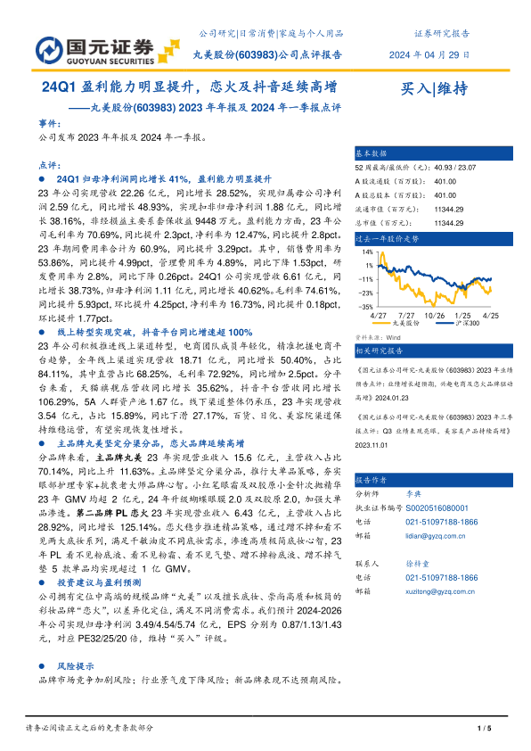 公司拥有定位中高端的规模品牌“丸美”以及擅长底妆、崇尚高质和极简的彩妆品牌“恋火”,以差异化定位,满足不同消费需求。我们预计2024-2026年公司实现归母净利润3.49/4.54/5.74亿元,EPS分别为0.87/1.13/1.43元,对应PE32/25/20倍,维持“买入”评级。