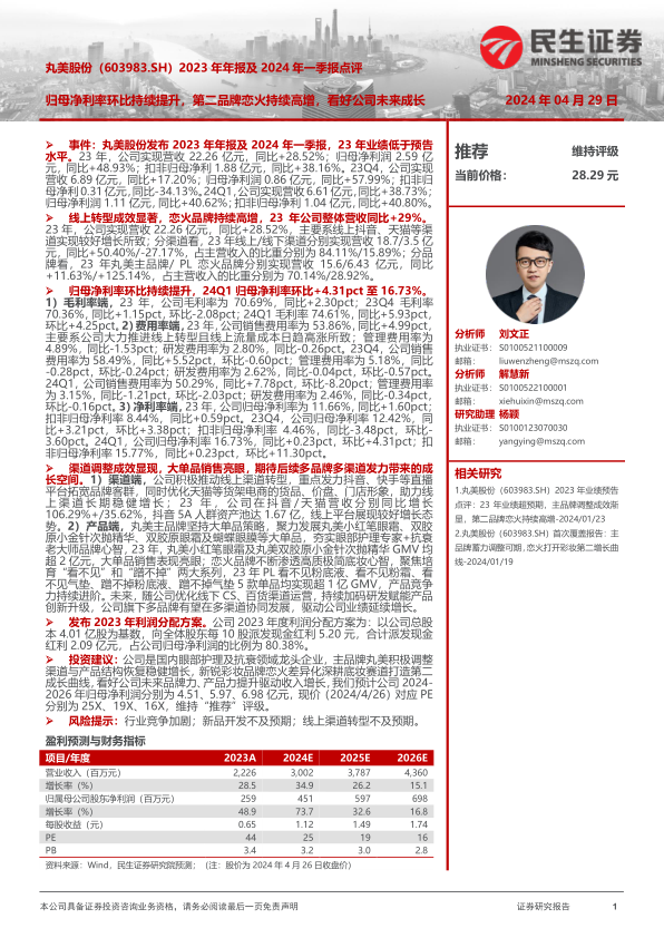 事件:丸美股份发布2023年年报及2024年一季报,23年业绩低于预告水平。23年,公司实现营收22.26亿元,同比+28.52%;归母净利润2.59亿元,同比+48.93%;扣非归母净利1.88亿元,同比+38.16%。23Q4,公司实现营收6.89亿元,同比+17.20%;归母净利润0.86亿元,同比+57.99%;扣非归母净利0.31亿元,同比-34.13%。24Q1,公司实现营收6.61亿元,同比+38.73%;归母净利润1.11亿元,同比+40.62%;扣非归母净利1.04亿元,同比+40.80%。
