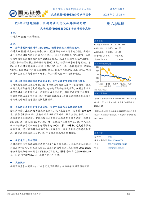 本报告对丸美股份(603983)2023年业绩预告进行了深度分析,核心观点如下: