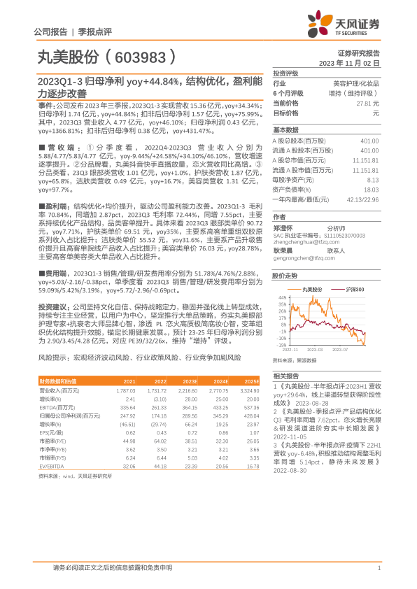 本报告对丸美股份2023年三季报进行了深入分析,指出公司营收和盈利能力均实现显著增长,主要得益于产品结构优化、线上渠道拓展以及品牌战略的有效实施。公司坚持长期发展战略,有望在未来继续保持增长势头,维持“增持”评级。