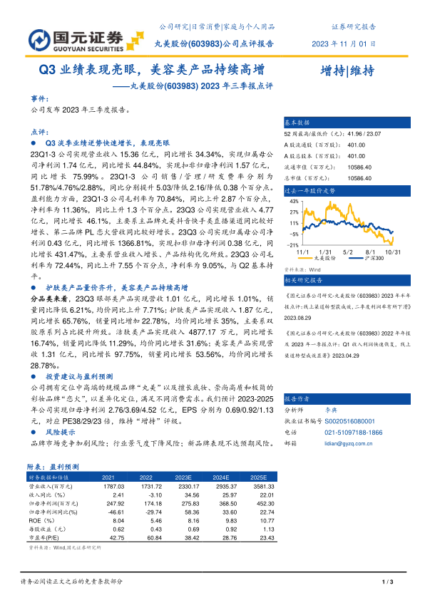 本报告对丸美股份(603983)2023年三季度报告进行了深度分析,核心观点如下: