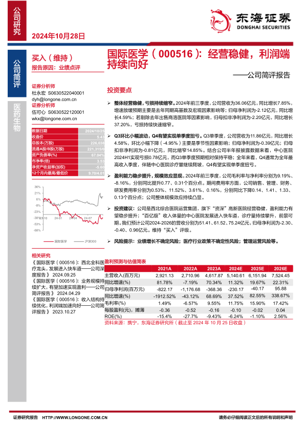 国际医学(000516)通过稳健经营和规模效应,亏损持续缩窄,盈利能力稳步提升。Q4有望实现单季度扭亏为盈,维持“买入”评级。但同时也需关注业绩增长、政策和运营管理等方面的不确定性风险。