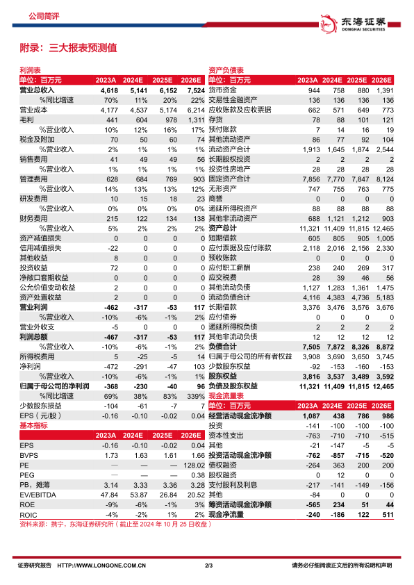 盈利能力稳步提升,规模效应显现。2024年前三季度,公司毛利率与净利率分别为9.19%、-8.16%,分别同比提升0.77、0.31个百分点。期间费用率方面,公司销售、管理、财务、研发费用率分别为0.53%、11.52%、3.61%、0.16%,分别同比下降0.14、1.41、1.33、0.13个百分点;公司整体规模效应持续凸显。
