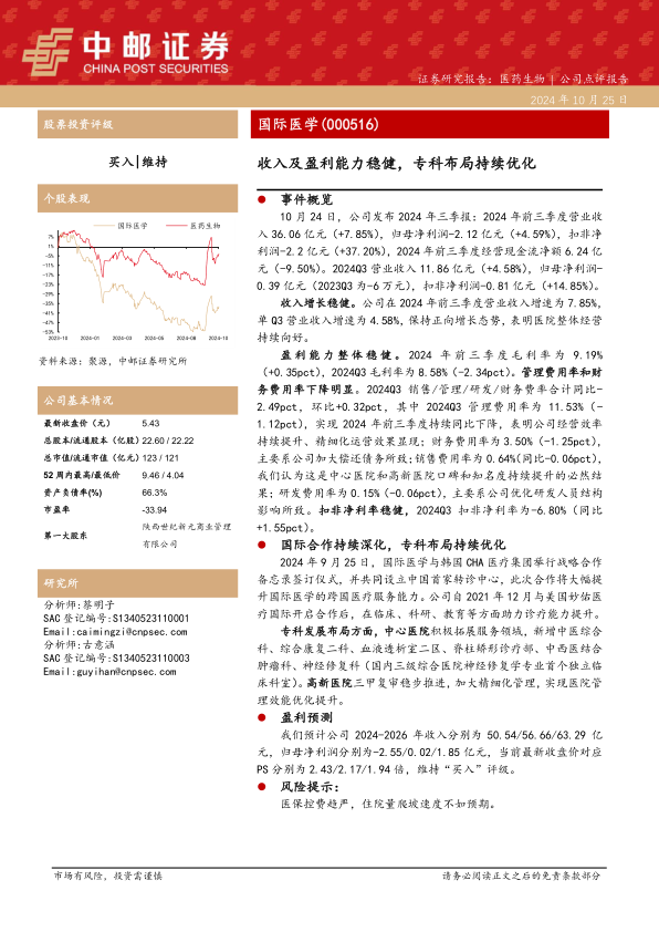 国际医学2024年三季报显示,公司营收稳健增长,盈利能力稳定,并通过国际合作和专科布局优化,不断提升医疗服务能力。虽然短期内仍面临亏损,但随着经营效率的提升和市场拓展,未来盈利能力有望改善。