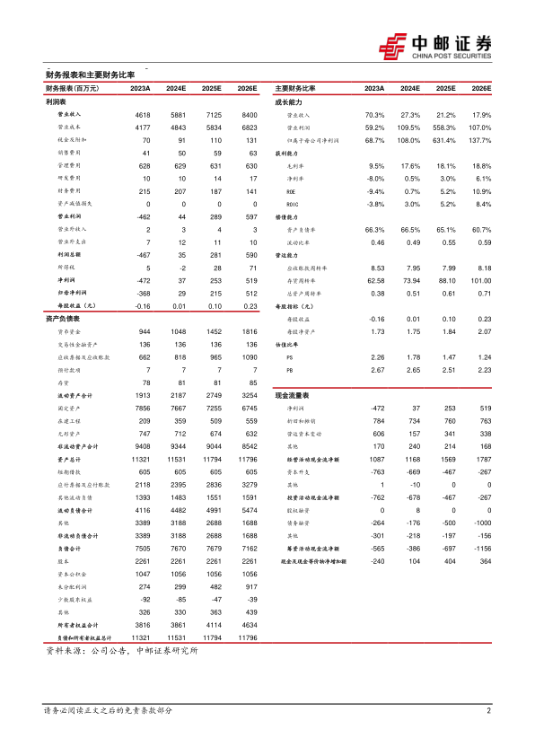 我们预计公司2024-2026年收入分别为58.81/71.25/84.00亿元,归母净利润分别为0.29/2.15/5.12亿元,当前最新收盘价对应PS分别为1.78/1.47/1.24倍,维持“买入”评级。