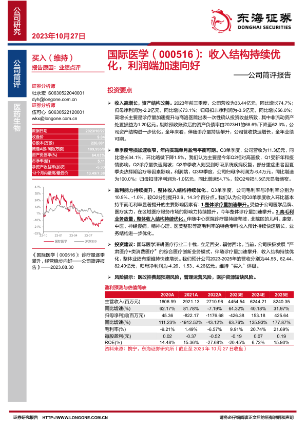 本报告的核心观点是:国际医学通过诊疗量加速提升和收入结构持续优化,实现了业绩的快速增长和盈利能力的提升。公司积极发展“严肃医疗+类消费医疗”的综合医疗创新业务模式,未来业绩有望维持快速增长。