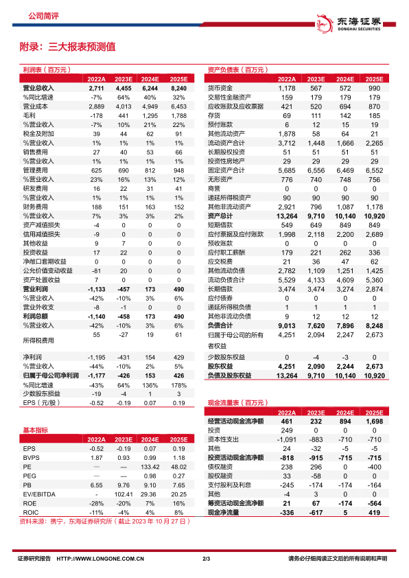基于公司良好的发展态势和未来的增长潜力,东海证券维持对国际医学“买入”评级。预计公司2023-2025年营收分别为44.55、62.44、82.40亿元,归母净利润分别为-4.26、1.53、4.26亿元。