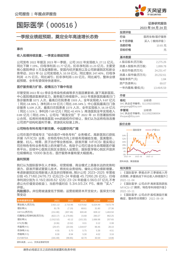 本报告对国际医学(000516)2022年年报及2023年一季报进行了分析,核心观点如下: