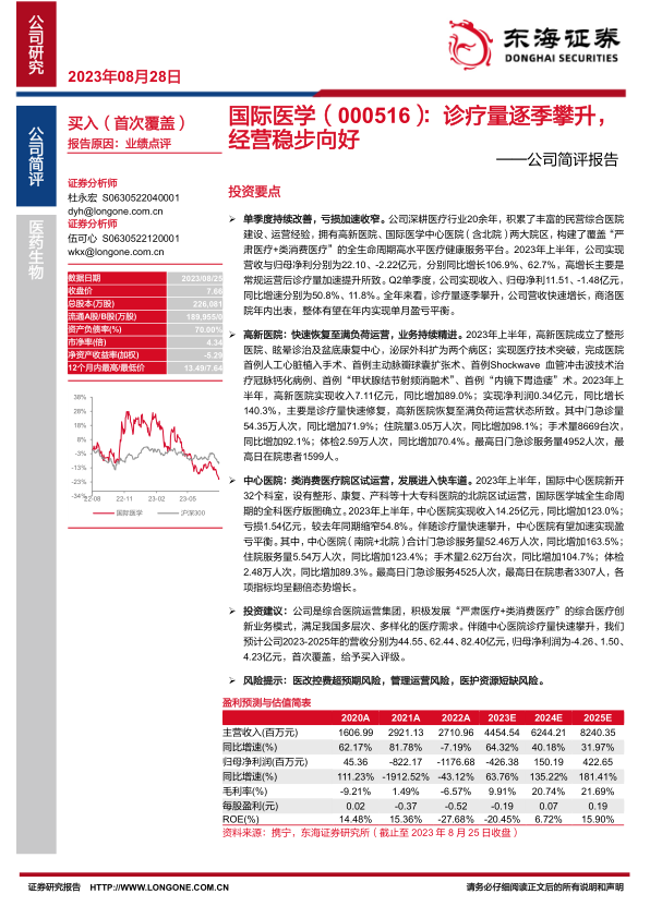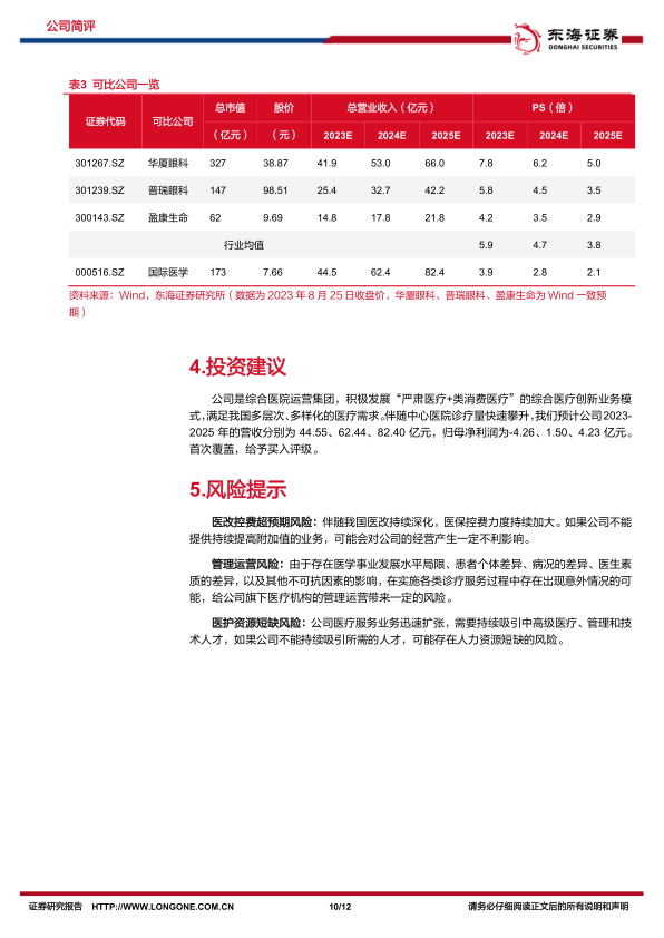 投资建议:公司是综合医院运营集团,积极发展“严肃医疗+类消费医疗”的综合医疗创新业务模式,满足我国多层次、多样化的医疗需求。伴随中心医院诊疗量快速攀升,我们预计公司2023-2025年的营收分别为44.55、62.44、82.40亿元,归母净利润为-4.26、1.50、4.23亿元,首次覆盖,给予买入评级。