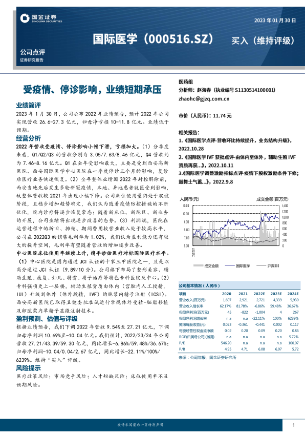本报告分析了国际医学2022年的业绩情况,指出受疫情影响营收小幅下滑,亏损加大。但随着疫情影响减弱,公司床位使用率提升,新院区和业务开展,未来业绩有望逐步改善。中心医院通过JCI认证,专科优势明显,辅助生殖资质升级,提升了竞争力。报告维持“买入”评级,但同时也提示了相关风险。