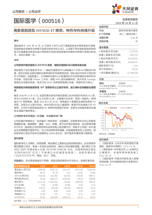 国际医学在人才梯队、经营规模、商业模式上具备长远的优势和潜力,此次获准开展试管婴儿技术,将进一步优化业务结构,催化公司业绩新增量。我们预计公司2022-2024年营业收入分别30.12/45.72/60.26亿元;归母净利润分别为-6.29/0.56/3.07亿元(不考虑公允价值变动收益),当前市值对应7.15/4.71/3.57XPS,维持“买入”评级。