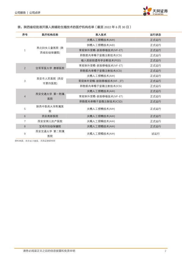 截至2020年12月31日,全国范围内获准开展试管婴儿技术的医疗机构共411家,其中公立机构367家,非公立机构44家,主要集中在东部、南部一线城市。陕西省内IVF资质稀缺,截至2022年6月30日,陕西省仅4家辅助生殖机构具有IVF资质,全部为公立医疗机构,其中仅西北妇女儿童医院一家医疗机构具备三代IVF牌照。公司作为陕西首家具有IVF资质的民营医疗机构,有望为当地提供差异化辅助生殖医疗服务需求。