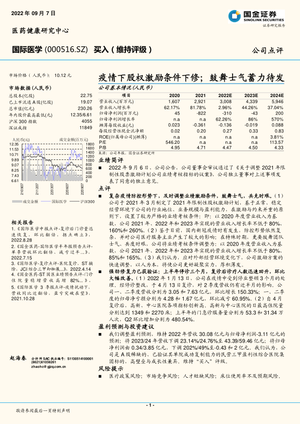 本报告分析了国际医学在疫情背景下调整股权激励计划的原因和意义,并对其上半年的业绩修复情况进行了评估。报告认为,公司及时调整激励方案有助于凝聚团队实力,且公司已展现出强劲的修复能力。尽管下调了未来营收和盈利预测,但维持了“买入”评级,认为公司是具有高壁垒和成长性的优质标的。同时,报告也提示了医疗政策、市场竞争、人才短缺和床位使用率等风险。