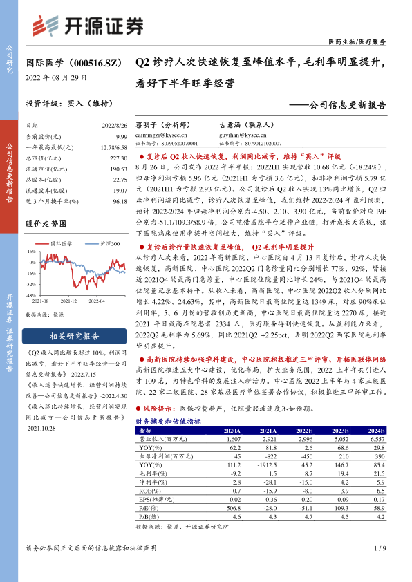 8月26日,公司发布2022年半年报:2022H1实现营收10.68亿元(-18.24%),归母净利润亏损5.96亿元(2021H1为亏损3.6亿元),扣非净利润亏损5.79亿元(2021H1为亏损2.93亿元)。公司复诊后Q2收入实现13%同比增长,Q2归母净利润端同比减亏,诊疗人次恢复至峰值,我们维持2022-2024年盈利预测,预计2022-2024年归母净利润分别为-4.50、2.10、3.90亿元,当前股价对应P/E分别为-51.1/109.3/58.9倍,公司凭借医院平台延伸产业链,打开成长天花板,旗下医院病床使用率提升空间较大,维持“买入”评级。