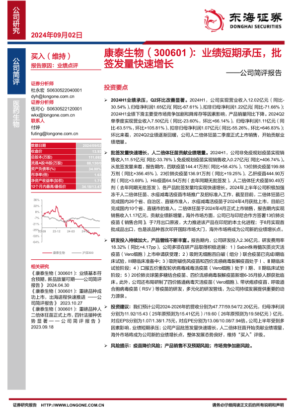 投资建议:我们预计公司2024-2026年的营收分别为47.77/59.54/72.20亿元,归母净利润分别为11.92/15.43(25年原预测为15.41亿元)/19.60(26年原预测为19.58亿元)亿元,对应EPS分别为1.07/1.38/1.75元,对应PE分别为13.06/10.08/7.94倍。公司上半年受到多因素影响,业绩短期承压;公司产品批签发量快速增长,人二倍体狂苗开始贡献业绩增量海外市场将成为公司新的业绩增长点,整体发展态势良好,维持“买入”评级。