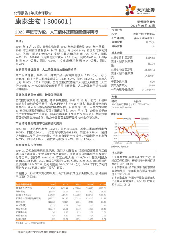 康泰生物2023年业绩实现扭亏为盈,主要受益于二类疫苗的销售增长。公司在研品种陆续获批,人二倍体狂苗放量值得期待。国际化战略稳步推进,13价肺炎球菌多糖结合疫苗在印度尼西亚获批。报告调整了盈利预测,但维持“买入”评级。投资者应关注行业政策变动、新产品研发进度以及接种疫苗不良事件等风险。