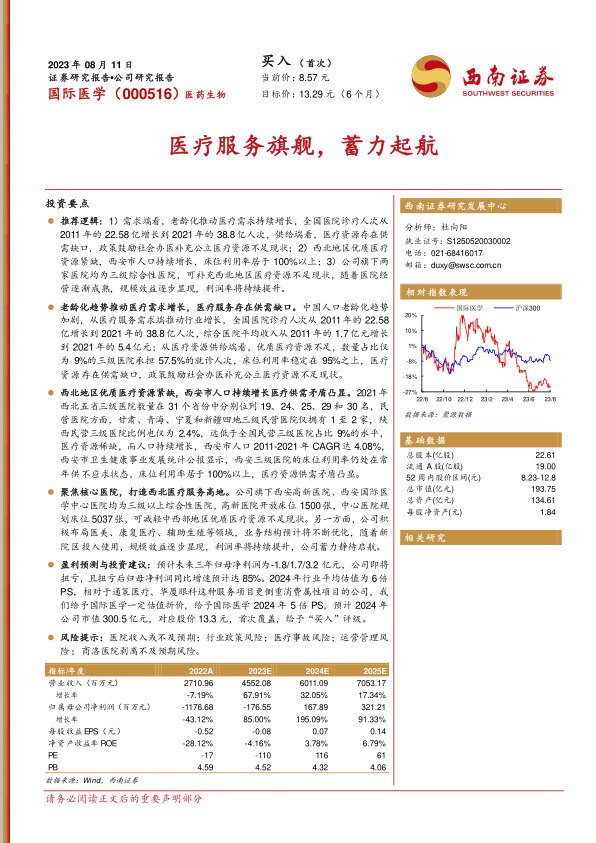 国际医学(000516)正处于从传统零售向纯医疗服务转型的关键阶段,并已在西北地区成功布局高品质医疗服务网络。面对中国人口老龄化带来的医疗需求增长和国家对社会办医的政策支持,公司旗下的西安高新医院、西安国际医学中心医院及西安国际康复医学中心医院,凭借其先进的医疗设施、专业的专家团队和特色专科服务,有望抓住市场机遇。尽管2022年受外部因素影响业绩承压,但2023年第一季度已展现强劲复苏势头,预计未来三年将实现扭亏为盈并保持高速增长。报告给予公司“买入”评级,目标价13.29元,但投资者需关注医疗服务收入、政策、运营管理及资产剥离等潜在风险。