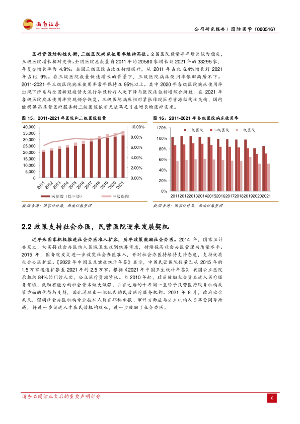 推荐逻辑: 1)需求端看,老龄化推动医疗需求持续增长,全国医院诊疗人次从 ]2011 年的 22.58亿增长到 2021年的 38.8亿人次,供给端看,医疗资源存在供需缺口,政策鼓励社会办医补充公立医疗资源不足现状; 2)西北地区优质医疗资源紧缺,西安市人口持续增长,床位利用率居于 100%以上; 3)公司旗下两家医院均为三级综合性医院,可补充西北地区医疗资源不足现状,随着医院经营逐渐成熟,规模效益逐步显现,利润率将持续提升。