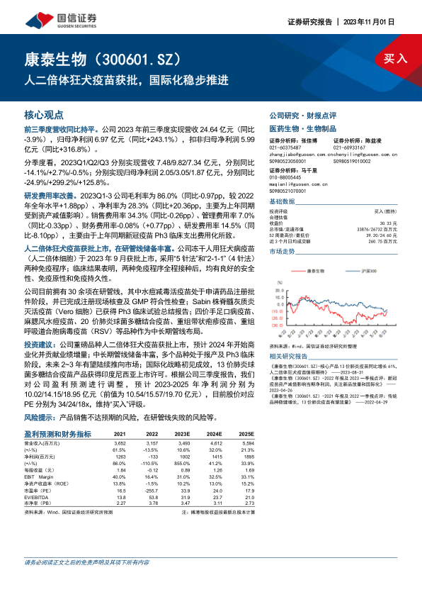 投资建议:公司重磅品种人二倍体狂犬疫苗获批上市,预计2024年开始商业化并贡献业绩增量;中长期管线储备丰富,多个品种处于报产及Ph3临床阶段,未来2~3年有望陆续推向市场;国际化战略初见成效,13价肺炎球菌多糖结合疫苗产品获得印度尼西亚上市许可。根据公司三季度报告,我们对公司盈利预测进行调整,预计2023-2025年净利润分别为10.02/14.15/18.95亿元(前值为10.54/15.57/19.70亿元),目前股价对应PE分别为34/24/18x,维持“买入”评级。
