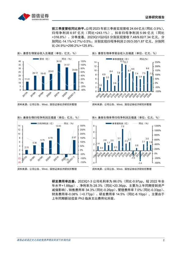 2023年前三季度,康泰生物实现营业收入24.64亿元,同比略有下降3.9%。然而,公司的盈利能力显著提升,归属于母公司股东的净利润达到6.97亿元,同比激增243.1%;扣除非经常性损益后的归母净利润为5.99亿元,同比大幅增长316.8%。这主要归因于上年同期新冠疫苗资产减值的影响消除。