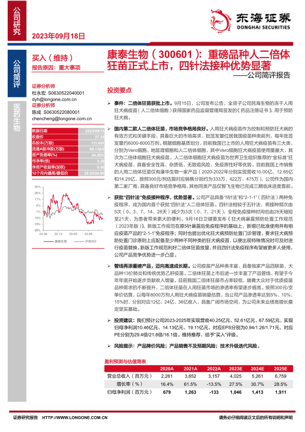 事件:二倍体狂苗获批上市。9月15日,公司发布公告,全资子公司民海生物的冻干人用狂犬病疫苗(人二倍体细胞)获得国家药品监督管理局签发的《药品注册证书》,用于预防狂犬病。