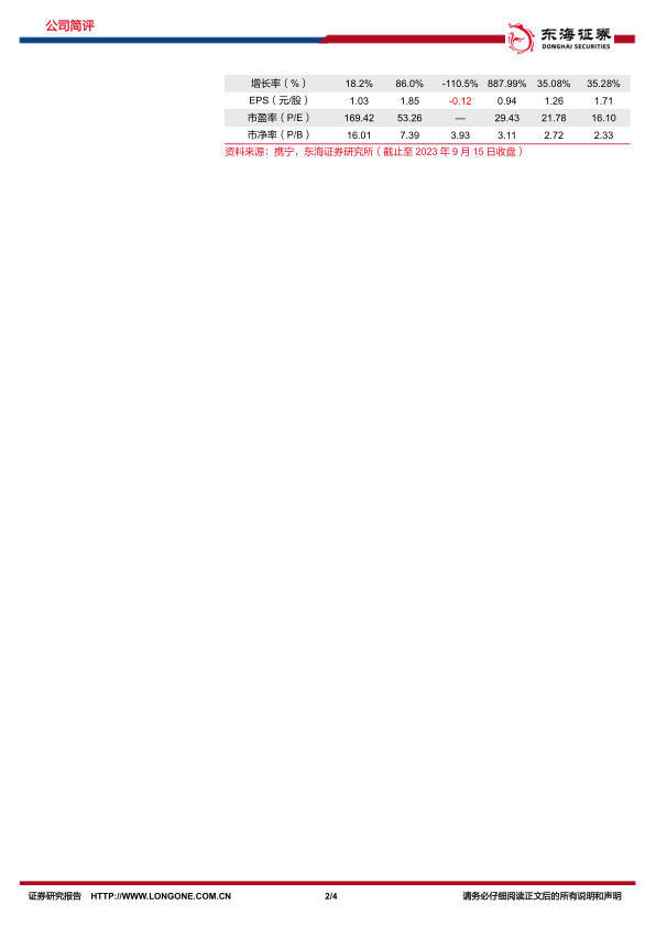 预计公司2023-2025年实现营收40.25亿元、52.61亿元、67.59亿元,实现归母净利润10.46亿元、14.13亿元、19.11亿元,对应EPS分别为0.94/1.26/1.71元,对应PE分别为29.4倍/21.8倍/16.1倍。维持推荐,给予“买入”评级。