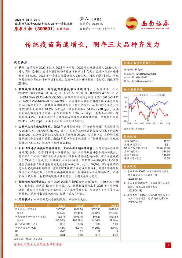 本报告对康泰生物2022年及2023年一季度业绩进行了分析,认为公司常规疫苗业务增长迅速,有效对冲了新冠疫苗销售下滑的影响。未来几年,公司预计将有多款新产品上市,有望显著提升业绩。维持对康泰生物“买入”评级,但需关注新产品研发进度和产品降价风险。