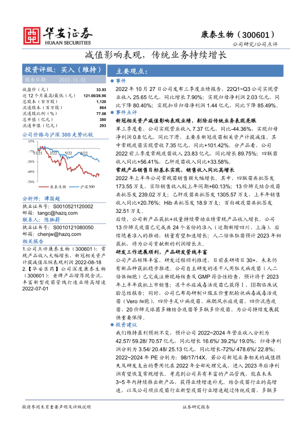 我们维持盈利预测不变,预计公司2022~2024年营业收入分别为42.57/59.28/70.57亿元,同比增长16.6%/39.2%/19.0%;归母净利润分别为3.54/20.48/25.13亿元,同比增长-72%/478.6%/22.8%;2022~2024年PE分别为:98/17/14X。若公司新冠业务相关的减值损失及研发支出的费用化在2022年全部处理完成,进入2023年后净利润有望恢复常规增长。考虑到公司具有丰富的产品管线,能在未来3~5年内持续推出新产品,获得业绩增速补充。结合疫苗行业的高增速,以及公司顺应疫苗行业新型疫苗行业增速超过传统疫苗、多联多价苗替代单苗的发展趋势、国产替代及疫苗出海进程不断加深的趋势,我们维持公司“买入”评级。