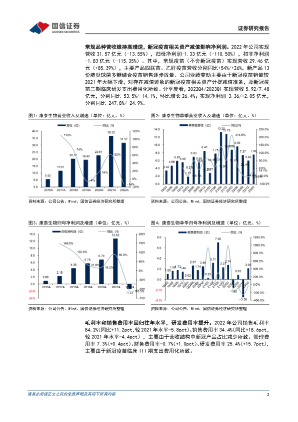 常规品种营收维持高增速,新冠疫苗相关资产减值影响净利润。2022年公司实现营收31.57亿元(-13.55%),归母净利润-1.33亿元(-110.50%),扣非净利润-1.83亿元(-115.35%)。其中,常规疫苗(不含新冠疫苗)实现营收29.46亿元(+85.39%),主要产品四联苗、乙肝疫苗营收分别同比+54%/+26%,新产品13价肺炎球菌多糖结合疫苗销售逐步放量。公司业绩变动主要由于新冠疫苗销量较2021年大幅下滑,对存在减值迹象的新冠疫苗相关资产计提减值准备,及新冠疫苗三期临床研发支出费用化所致。分季度看,2022Q4/2023Q1实现营收5.92/7.48亿元,分别同比-53.5%/-14.1%,环比增长26.4%;实现净利润-3.36/+2.05亿元,分别同比-247.8%/-24.9%。