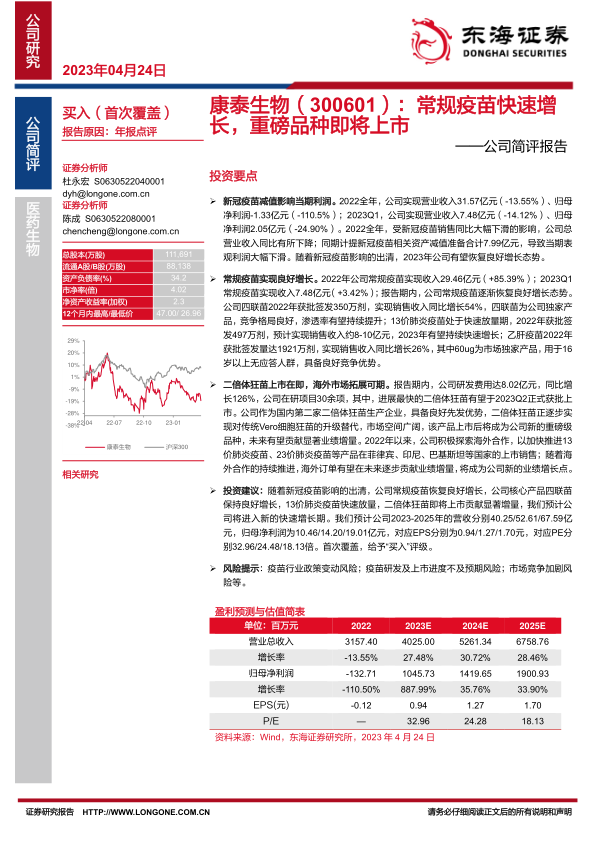 鉴于新冠疫苗影响的出清、常规疫苗的良好增长、核心产品四联苗的持续增长、13价肺炎疫苗的快速放量以及二倍体狂苗的即将上市,预计康泰生物将进入新的快速增长期。报告预测公司2023-2025年的营业收入将分别达到40.25亿元、52.61亿元和67.59亿元,归母净利润分别为10.46亿元、14.20亿元和19.01亿元,对应EPS分别为0.94元、1.27元和1.70元,对应PE分别为32.96倍、24.48倍和18.13倍。基于此,首次覆盖给予“买入”评级。