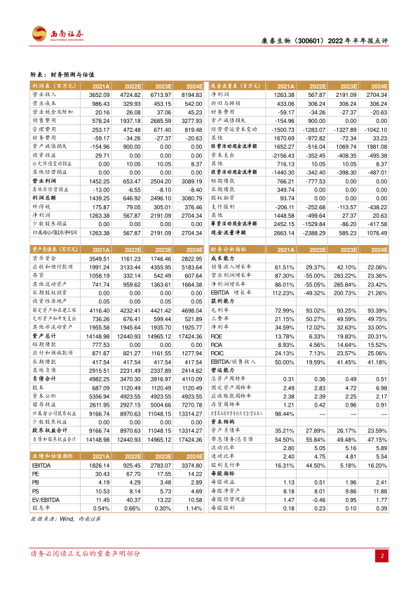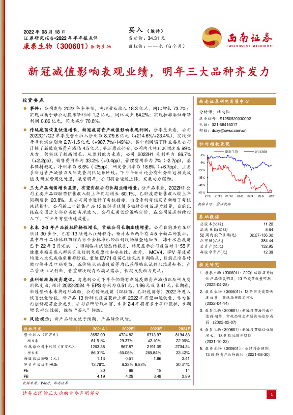 考虑到公司下半年仍将有新冠疫苗资产减值以及研发费用化支出,预计2022-2024年EPS分别为0.51元、1.96元及2.41元。长期来看,新冠影响未来将边际减弱,公司传统疫苗(四联苗、乙肝疫苗等)在2022年进入恢复放量阶段,新产品13价肺炎疫苗有望加速放量。作为国内创新疫苗企业龙头,公司在研管线丰富,未来2-4年将有多个品种获批,长期增长确定性强,维持“买入”评级。