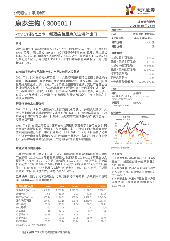 鉴于2021年新冠疫苗可能对常规疫苗接种产生影响,但预计2022-2023年有望恢复增长,天风证券调整了康泰生物2021-2023年的营业收入预测至22.78亿元、41.38亿元和66.66亿元(原预测为36.57亿元、60.50亿元和72.49亿元),同比增速分别为0.73%、81.68%和61.09%。归母净利润预测调整至6.96亿元、12.60亿元和20.52亿元(原预测为11.20亿元、19.41亿元和23.46亿元),对应EPS分别为1.01元、1.83元和2.99元。考虑到新冠疫苗带来的业绩弹性,维持“买入”评级。 报告提示的风险包括:研发进度不及预期、疫苗获批进度不及预期、产品销售不及预期以及接种疫苗不良事件的风险。