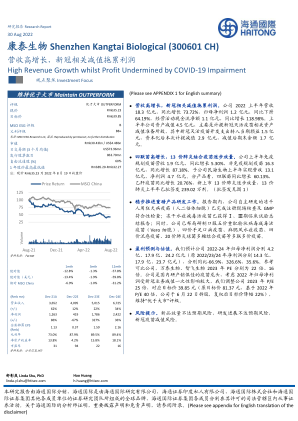 盈利预测与估值。我们预计公司2022-24年归母净利润分别4.2亿、17.9亿、24.2亿元(原2022/23/24年净利润分别14.3亿、17.9亿、23.7亿元),分别同比-66.9%、326.6%、35.6%。参考可比公司,万泰生物、智飞生物2023年PE分别为22倍、16倍。公司是国内研产销俱佳的疫苗龙头,考虑2022年归母净利润受新冠业务减值一次性影响较大,我们调整公司2023年P/E25倍,对应目标价39.85元(原目标价81.37元,基于2022年P/E40倍,公司于6月22日拆股,复权后目标价降幅22%),维持“优于大市”评级。