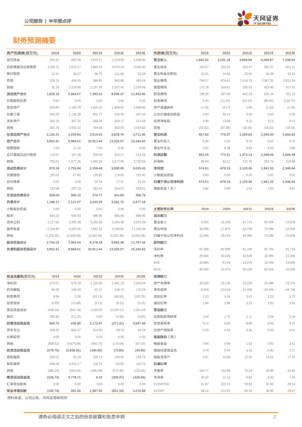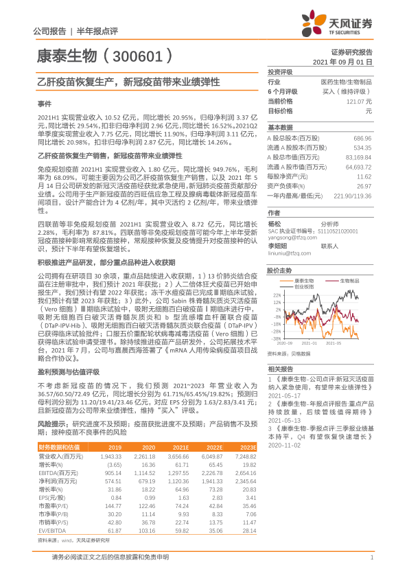 不考虑新冠疫苗的情况下,我们预测2021~2023年营业收入为36.57/60.50/72.49亿元,同比增长分别为61.71%/65.45%/19.82%;预测归母利润分别为11.20/19.41/23.46亿元,对应EPS分别为1.63/2.83/3.41元;且新冠疫苗为公司带来业绩弹性,维持“买入”评级。