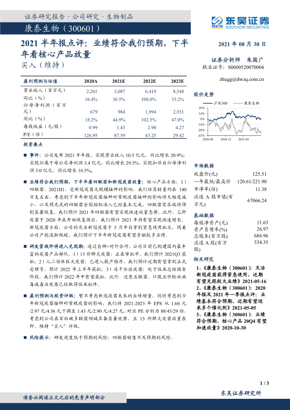 盈利预测与投资评级:暂不考虑新冠疫苗未来的业绩增量,同时考虑到今年新冠疫苗接种对常规疫苗的影响,我们将2021-2023年EPS从1.66元/2.97元/4.36元下调至1.43元/2.90元/4.27元,对应PE分别为88/43/29倍,考虑到公司在百白破多联苗领域具备显著优势,且13价肺炎疫苗放量在即,维持“买入”评级。