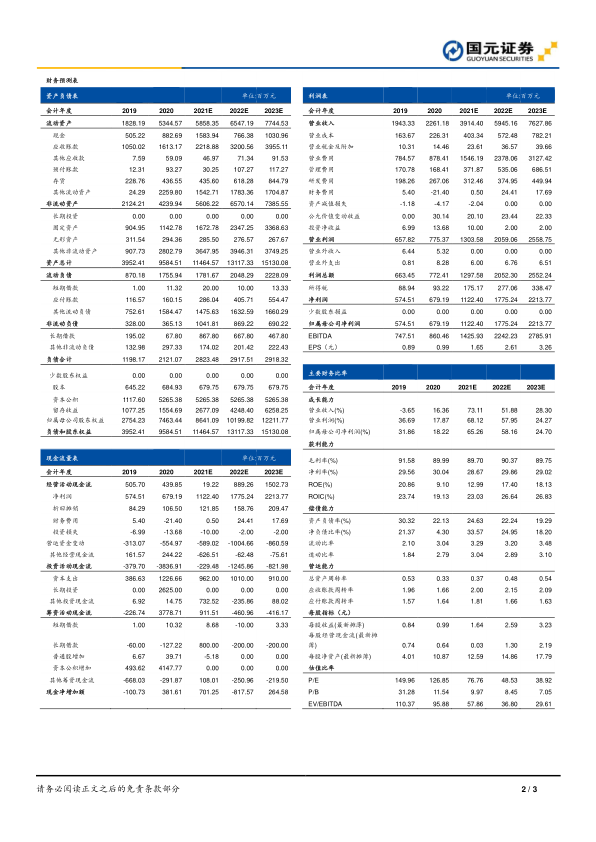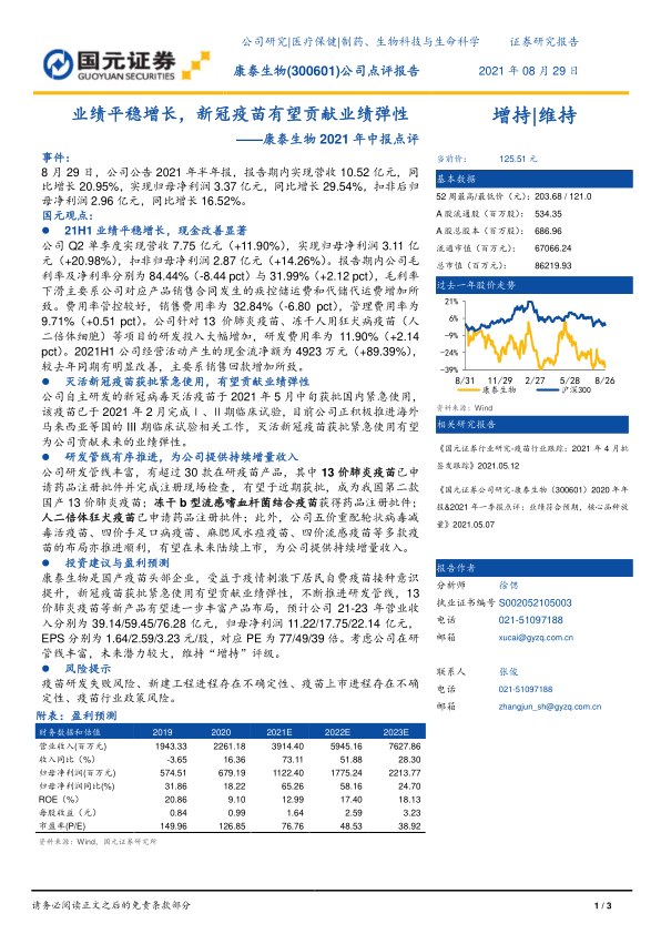 国元证券维持康泰生物“增持”评级。预计公司2021-2023年营业收入分别为39.14亿元、59.45亿元、76.28亿元,归母净利润分别为11.22亿元、17.75亿元、22.14亿元。对应EPS分别为1.64元/股、2.59元/股、3.23元/股,对应PE分别为77倍、49倍、39倍。主要风险包括疫苗研发失败风险、新建工程进程不确定性、疫苗上市进程不确定性以及疫苗行业政策风险。