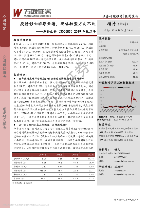本报告分析了海特生物(300683)2019年报及2020年一季度业绩,认为疫情对公司短期业绩造成冲击,但公司战略转型方向不变。