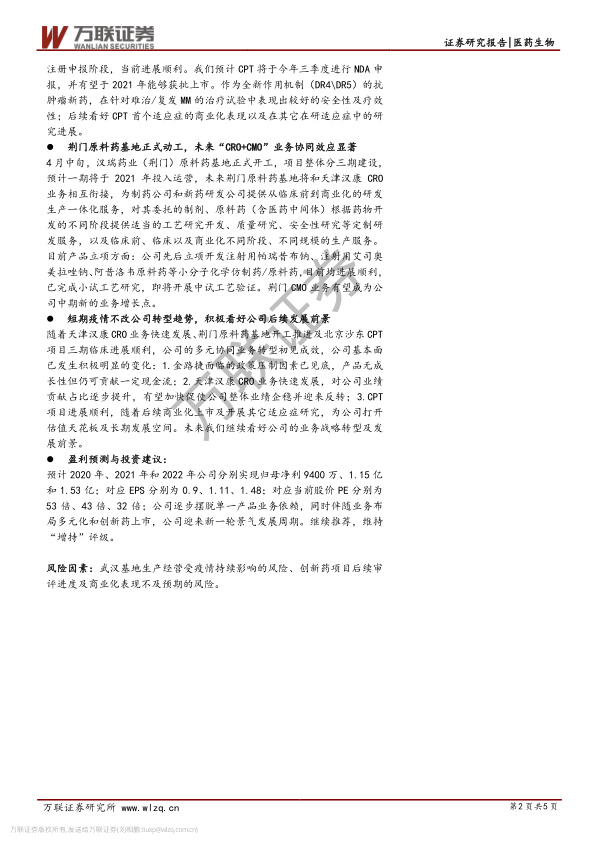 本报告认为,海特生物短期业绩受疫情影响,但公司战略转型方向不变,多元协同业务转型初见成效。CPT项目进展顺利,荆门原料药基地动工,未来“CRO+CMO”业务协同效应显著。维持“增持”评级,但需关注武汉基地生产经营受疫情持续影响的风险、创新药项目后续审评进度及商业化表现不及预期的风险。