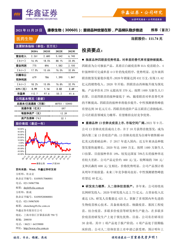 综合考虑新冠疫苗影响,预测公司2021-2023年实现归属于母公司净利润分别为15.51亿元、27.46亿元、31.07亿元。首次推荐,给予“推荐”评级。