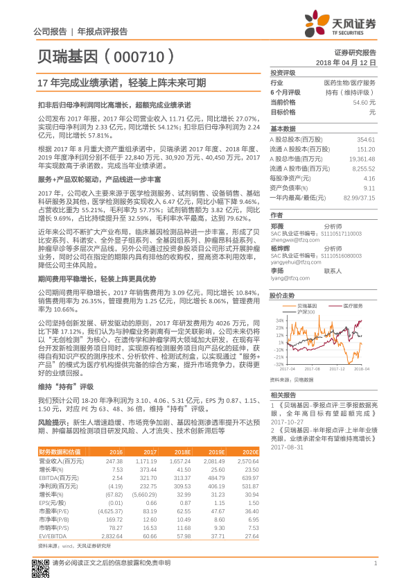 贝瑞基因2017年年报显示,公司超额完成业绩承诺,通过“服务+产品”双轮驱动模式,不断丰富产品线,提升市场竞争力。公司期间费用控制良好,未来将继续加大研发投入,巩固在无创检测领域的领先地位。综合考虑公司业绩、发展战略和市场前景,维持对贝瑞基因“持有”评级,但需关注新生儿增速、市场竞争、研发风险等因素。