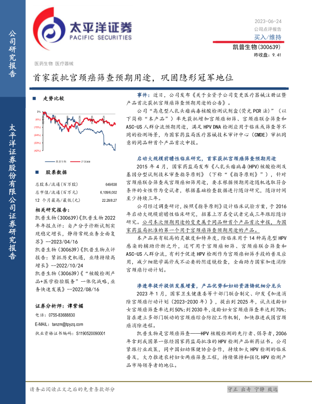 本报告主要分析了凯普生物(300639)在宫颈癌筛查领域的市场地位和发展前景,并对其盈利能力进行了预测和投资评级。