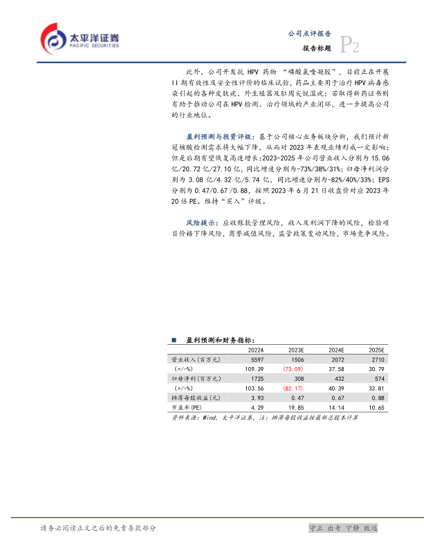 盈利预测与投资评级:基于公司核心业务板块分析,我们预计新冠核酸检测需求将大幅下降,从而对2023年表观业绩形成一定影响;但是后期有望恢复高速增长:2023-2025年公司营业收入分别为15.06亿/20.72亿/27.10亿,同比增速分别为-73%/38%/31%;归母净利润分别为3.08亿/4.32亿/5.74亿,同比增速分别为-82%/40%/33%;EPS分别为0.47/0.67/0.88,按照2023年6月21日收盘价对应2023年20倍PE。维持“买入”评级。
