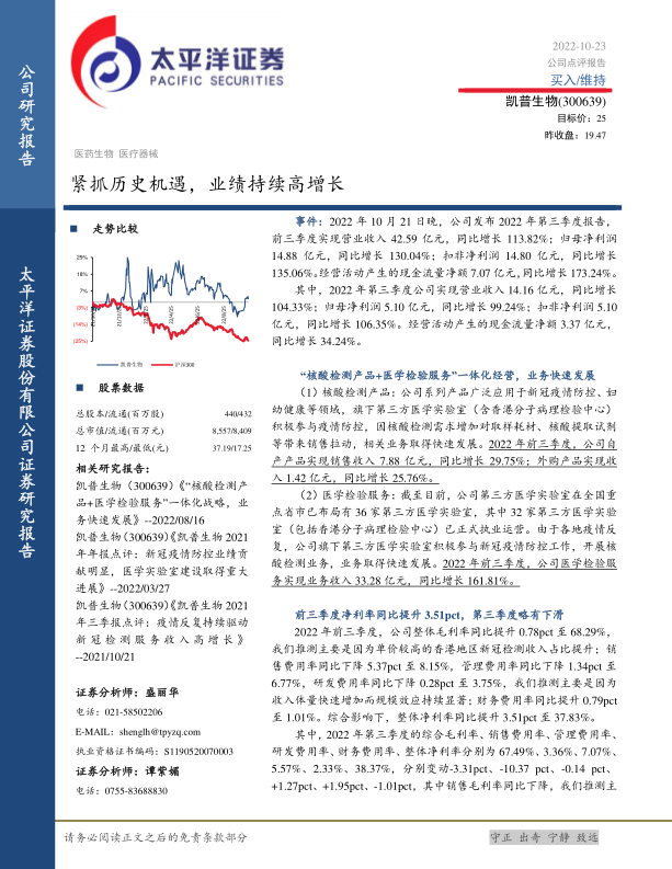 凯普生物凭借“核酸检测产品+医学检验服务”一体化经营模式,抓住了新冠疫情防控带来的历史机遇,实现了业绩的快速增长。公司前三季度净利率同比提升,盈利能力增强。维持“买入”评级,但需关注疫情影响、市场竞争和政策变化等风险因素。