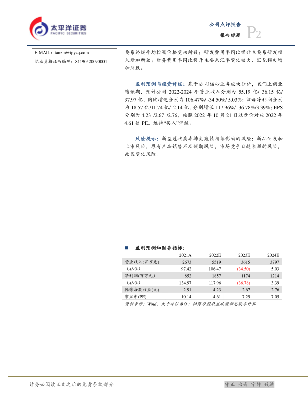 其中,2022年第三季度的综合毛利率、销售费用率、管理费用率、研发费用率、财务费用率、整体净利率分别为67.49%、3.36%、7.07%、5.57%、2.33%、38.37%,分别变动-3.31pct、-10.37pct、-0.14pct、+1.27pct、+1.95pct、-1.01pct,其中销售毛利率同比下降,我们推测主要系终端平均检测价格变动所致;研发费用率同比提升主要系研发投入增加所致;财务费用率同比提升主要系汇率变化较大、汇兑损失增加所致。