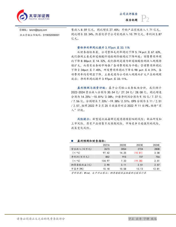 公司整体毛利率同比下降5.74个百分点至67.63%,主要系新冠核酸终端检测价格下降。销售费用率同比下降8.80个百分点至14.32%,管理费用率同比下降2.34个百分点至7.45%,研发费用率同比下降0.98个百分点至4.31%,各项费用率均有明显下降,主要得益于收入规模扩大产生的规模效应。净利率同比提升3.97个百分点至33.11%。基于核心业务板块分析,预计2022-2024年营业收入分别为30.54亿、27.24亿、28.08亿,归母净利润分别为9.15亿、7.37亿、7.56亿。维持“买入”评级,目标价45元。