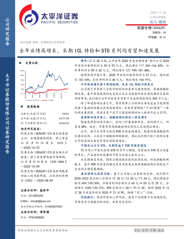 本报告对凯普生物(300639)进行了公司点评,维持“买入”评级,目标价50元。报告分析了公司2020年业绩高增长的原因,主要得益于新冠检测业务的贡献和原有第三方检测业务的拓展。同时,报告也展望了公司未来的发展潜力,包括“产品+服务”一体化的发展模式,以及PCR实验室建设带来的长期利好。报告还对公司未来的收入和利润进行了预测,并提示了相关风险。