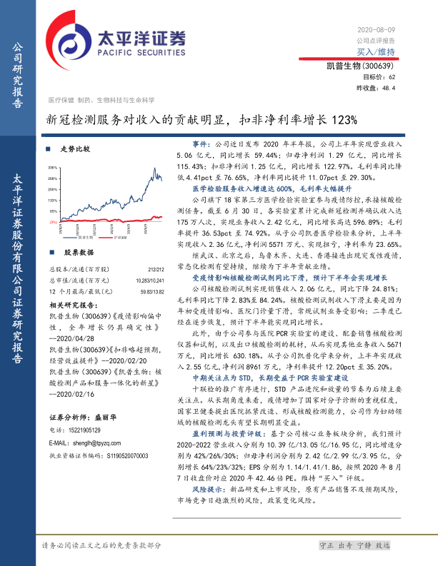 基于核心业务板块分析,太平洋证券预计凯普生物2020-2022年营业收入分别为10.39亿、13.05亿和16.95亿,同比增速分别为42%、26%和30%。归母净利润分别为2.42亿、2.99亿和3.95亿,分别增长64%、23%和32%。摊薄每股收益(EPS)分别为1.14元、1.41元和1.86元。按照2020年8月7日收盘价,对应2020年PE为42.46倍。报告维持“买入”评级。