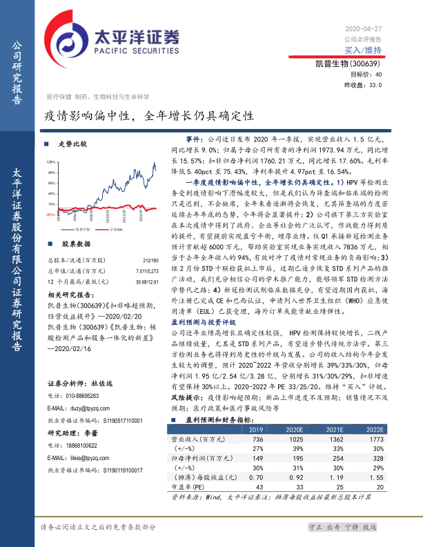 基于上述盈利预测,公司2020年至2022年的市盈率(PE)分别为33倍、25倍和20倍。报告维持对凯普生物的“买入”评级,并设定目标价为40元。同时,报告提示了潜在风险,包括疫情影响超预期、新品上市进度不及预期、销售情况不及预期以及医疗政策和医疗事故风险等。