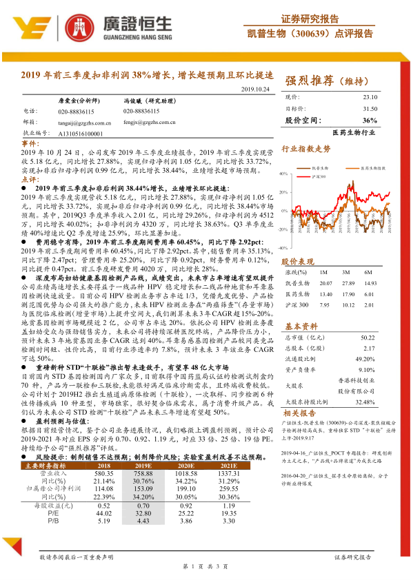 凯普生物在2019年前三季度展现出强劲的业绩增长,扣非净利润同比增长38.44%,且第三季度增速环比显著提速。这主要得益于公司在妇幼健康基因检测领域的深耕,HPV检测业务稳定增长,地贫和耳聋基因检测业务快速放量。同时,公司通过有效的费用控制和持续的研发投入,为未来的可持续发展奠定了基础。即将推出的独家STD“十联检”产品有望打开新的市场空间,成为公司未来业绩增长的重要驱动力。综合来看,凯普生物凭借其核心产品线的优势和新产品的市场潜力,预计将保持持续高成长,分析师维持“强烈推荐”评级。