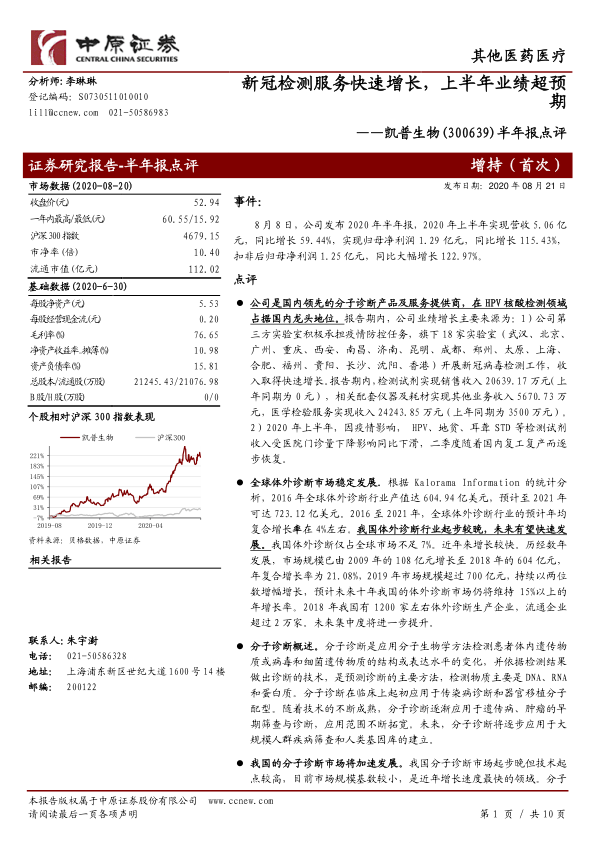 凯普生物在2020年上半年凭借新冠检测服务的快速增长,实现了营收和净利润的大幅提升,展现了其在分子诊断领域的快速响应能力和市场潜力。公司作为HPV核酸检测的龙头企业,正积极布局未来,通过“核酸99”战略规划,全面拓展分子诊断产品线,并利用导流杂交等核心技术平台,持续巩固市场地位。同时,公司通过募投项目加大对核酸分子诊断产品产业化、第三方实验室升级、新产品研发以及抗HPV药物研发的投入,以抓住中国体外诊断市场,特别是分子诊断领域的高速增长机遇。尽管面临医联体覆盖加速和新产品推广不及预期的风险,但公司凭借其深厚的研发实力和市场布局,预计未来业绩将保持稳健增长。